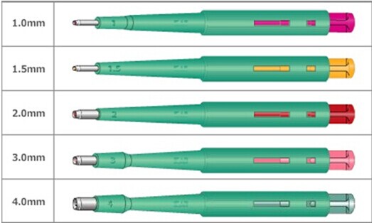 截取細微樣本的得力助手!光滑鋒利的刀頭,精巧的樣本彈射,以及拿捏部位的防滑設計等均獨具匠心!每種尺寸清晰標于桿上,不同顏色的按鈕便于辨識。