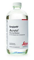 Surgipath®,Acrytol®,一款快干型封片劑(病理快干封片膠),顧名思義,這款封片劑的溶質(zhì)成分是丙烯酸樹脂;溶劑是甲苯、二甲苯、以及二甲苯替代物;同時添加一種抗氧化劑(用來阻止染料的褪色和年輪紋的形成)。低粘度,封片均勻,不形成氣泡,需要蓋玻片,常用于病理實驗室中。