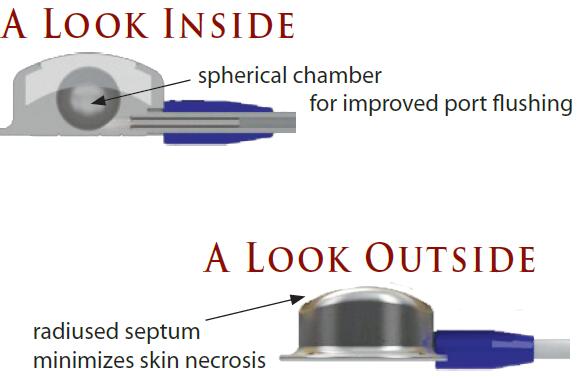 三、SwirlPort:具有球形腔室的輸液港,SwirlPort為研究人員提供了新的輸液港技術(shù),球形腔室的形狀消除了所有出現(xiàn)“潴留漿的角落,與類似大小的輸液港比較,減少了腔室整體體積。這種腔室的形狀已被證明對(duì)腔室沖洗體積有可測(cè)量的影響,該體積必須用來(lái)清潔”腔室的血液和藥物殘留量。與傳統(tǒng)端口相比,球形的腔室沖洗流量最低,且該流量與沖洗流速無(wú)關(guān)。目前可以提供三種大小:大-MAX(0.53ml);中-MID(0.33ml);小-MIN(0.18ml)。