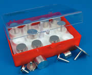 4.通用型銷釘型樣品臺盒:Pin mount storage box.。銷釘直徑為3.1mm的樣品臺均可以放置。里面有18個臺位(編碼1-18)??梢匝b18個臺面直徑12.7mm的;或8個臺面直徑25mm;或232mm;或238mm;或250mm。