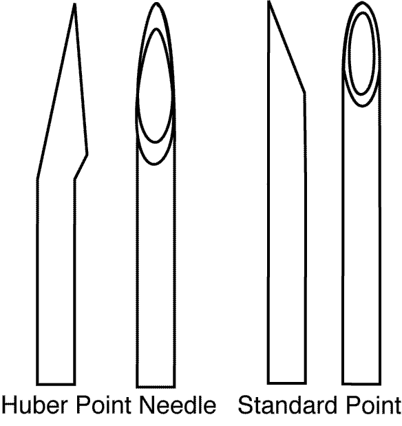 提倡用此針配套植入式輸液港或者肝素帽使用,可以大大延長植入式輸液港或肝素帽的壽命。普通注射針和Huber注射針對植入式輸液港的隔膜進行了穿刺落屑比對試驗,結果表明,采用Huber注射針穿刺后的落屑數(shù)均明顯少于普通注射針的試驗結果(huber注射針又稱不落屑針)。這是因為Huber注射針的針尖采用了獨特的幾何形狀,防止或者減少了取芯作用(針頭穿過材料時一部分進入到針尖附近腔中的現(xiàn)象)。